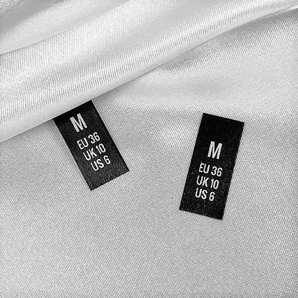 Kokomerkintä vaatteille, jotka on painettu hienolle satiinille, ultralaite leikkaus esitettyjen mittojen mukaan.