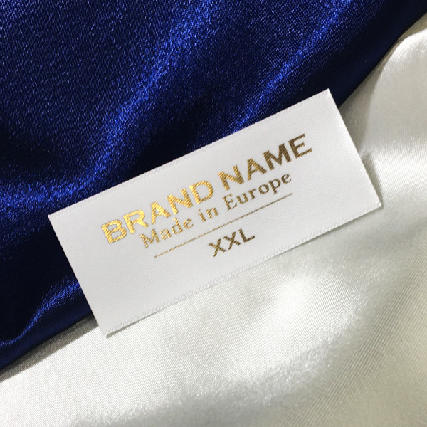 Tekstiililappu, joka on painettu mukautetuilla teksteillä ja ko’oilla satiinikankaalle ja leikattu esitettyjen mittojen mukaan.