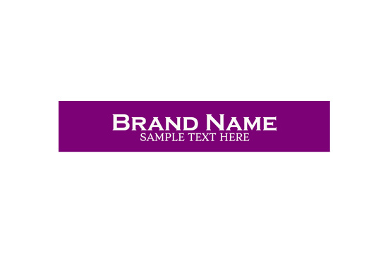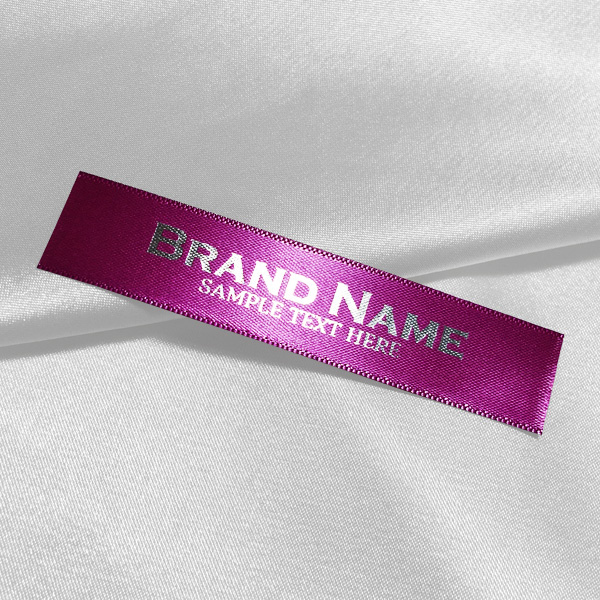Tuotemerkki, joka on painettu mukautetuilla teksteillä satiinikankaalle, leikattu esitettyjen mittojen mukaan.