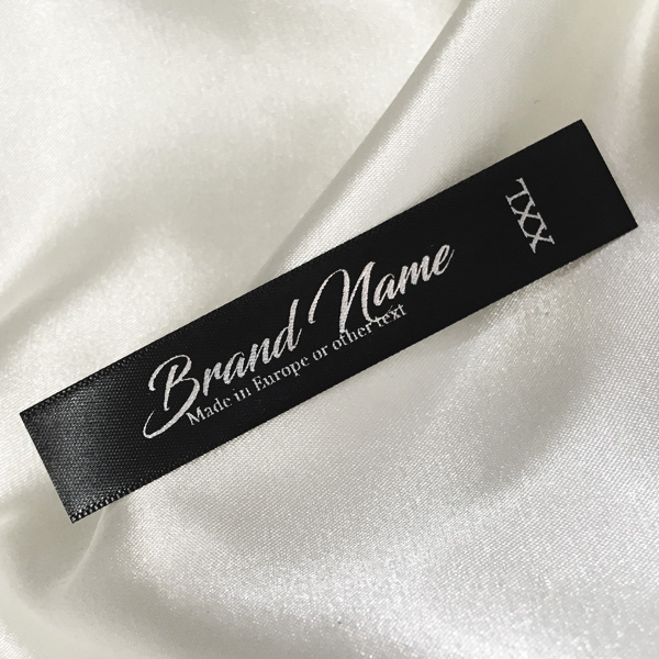 Mukautettu lappu TL-M21 joka on painettu satiinikankaalle ja sopii vaatteille, vaatetustarvikkeille ja muille tekstiilituotteille.