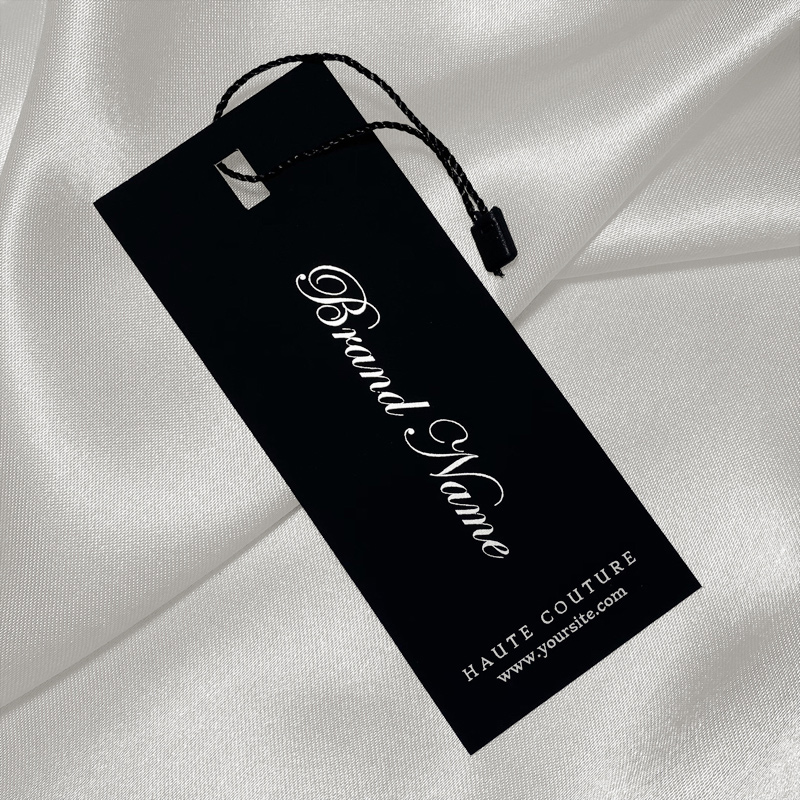 Pahvietiketti muovisinetillä, joka sopii vaatteille ja vaatetustarvikkeille, valmistettu paksusta mustasta pahvista, joka on laminoitu Soft Touch -kalvolla ja henkilökohtaisella Folio Hot Stamp -tyyppisellä hopeakirjauksella. Tämäntyyppinen ripustusetiketti on valmistettu korkealaatuisista materiaaleista, digitaalisen tulostuksen ja alan edistyneimmän tekniikan avulla.