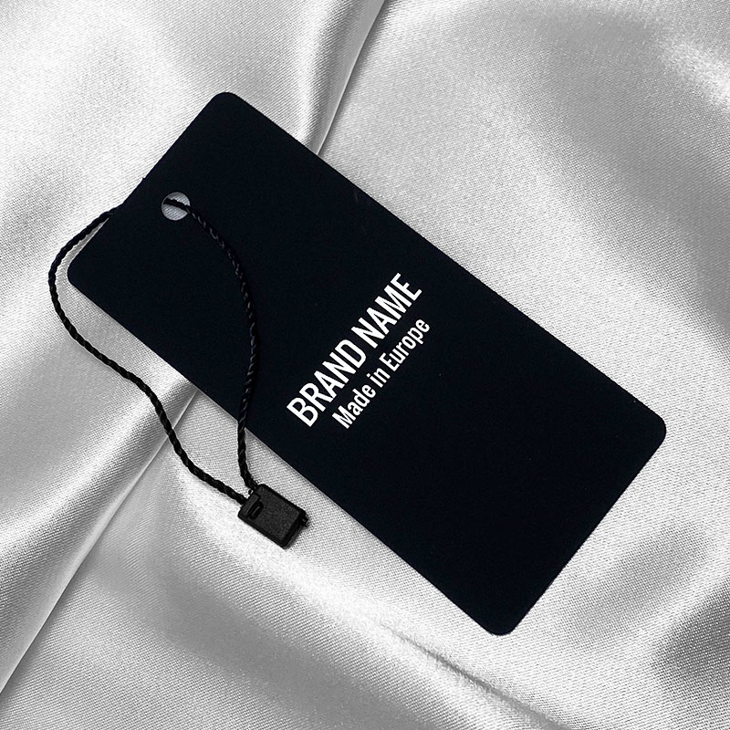 Etiketti tyylikäs jossa roikkuujohto, valmistettu mustasta pahvista, yksilöity hopeisella tekstillä tai logolla. Tämäntyyppinen ripustusetiketti on valmistettu korkealaatuisista materiaaleista, digitaalisen tulostuksen ja alan edistyneimmän tekniikan avulla.