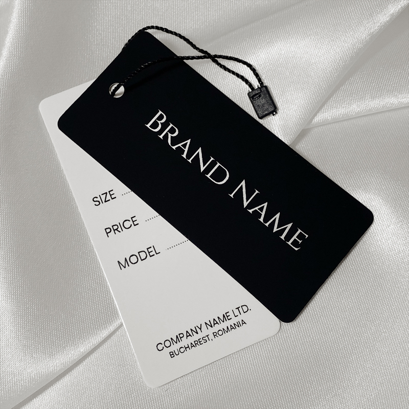 Setti, joka koostuu kahdesta mustavalkoisesta etiketistä, jotka ovat valmistettu laminoidusta pahvista ja jossa on hopeakirjoitus, ja muovisinetti mustalla narulla. Tämäntyyppinen ripustusetiketti on valmistettu korkealaatuisista materiaaleista, digitaalisen tulostuksen ja alan edistyneimmän tekniikan avulla.