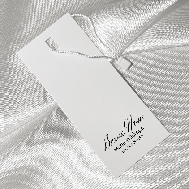 Muovisinetillä varustettu paperietiketti vaatteiden tai erilaisten tekstiilien kiinnittämiseen, valmistettu kiiltävästä muovitetusta pahvista, räätälöity tekstillä ja logolla toisella puolella. Tämäntyyppinen ripustusetiketti on valmistettu korkealaatuisista materiaaleista, digitaalisen tulostuksen ja alan edistyneimmän tekniikan avulla.