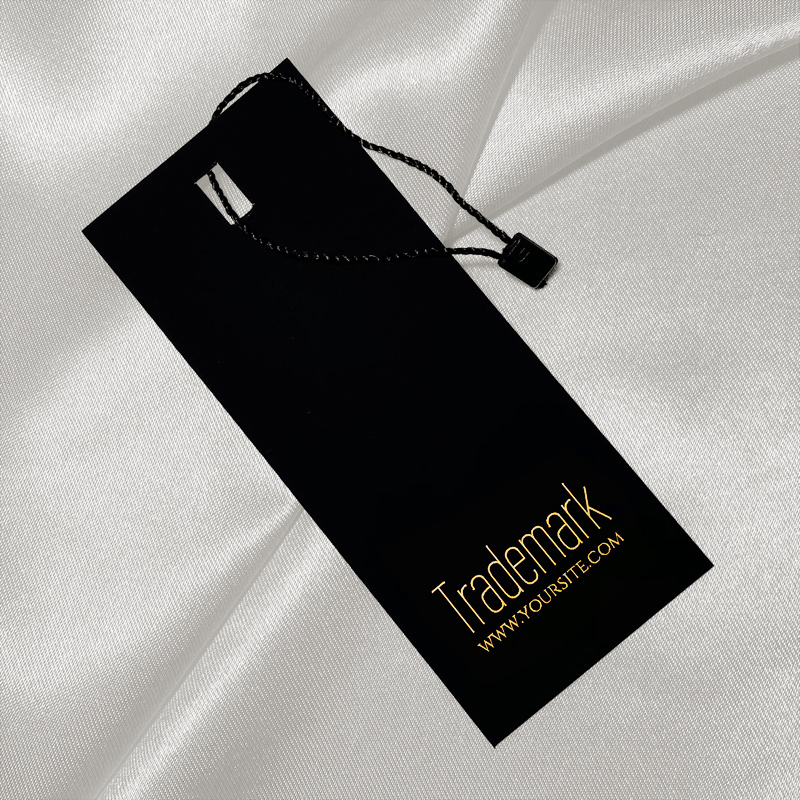 HT-M108-mallinen polyesterinauhalla ja sinetillä varustettu pahvietiketti vaatteille, valmistettu paksusta mustasta pahvista, joka on yksilöity kultaisella tekstillä tai logolla. Tämäntyyppinen ripustusetiketti on valmistettu korkealaatuisista materiaaleista, digitaalisen tulostuksen ja alan edistyneimmän tekniikan avulla.