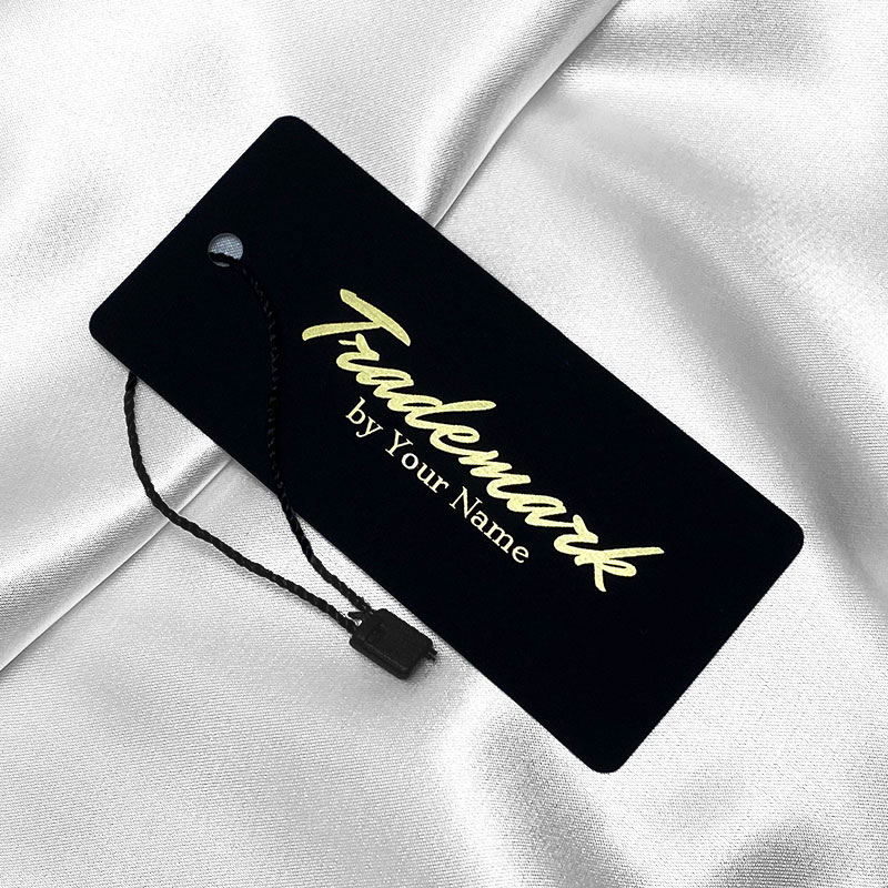 Etiketti valmistettu tilauksesta mustasta pahvista ja teksti tai mukautettu logo, joka on painettu lämpökuljetuksella Golden Folion avulla. Tämäntyyppinen ripustusetiketti on valmistettu korkealaatuisista materiaaleista, digitaalisen tulostuksen ja alan edistyneimmän tekniikan avulla.