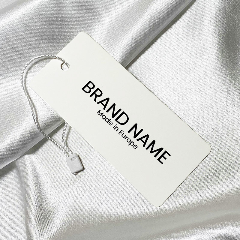 Räätälöity etiketti vaatteille, joissa on valkoinen johto, tilauksesta paksusta pahvista, painettu tekstillä tai brändin logolla. Tämäntyyppinen ripustusetiketti on valmistettu korkealaatuisista materiaaleista, digitaalisen tulostuksen ja alan edistyneimmän tekniikan avulla.