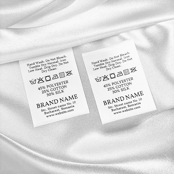 Pyykinhoito lappu, joka on valmistettu hienosta valkoisesta satiinista, mukautettuna valmistajan nimellä ja logolla, pesusymboleilla ja materiaalilla, jota käytetään ompeleen valmistamiseen. Tämän tyyppiset tekstiililaput ovat valmistettuja digitaalisen painamisen alan kehittyneintä tekniikkaa käyttäen, tekstiilitukialustalla. Laput ovat painettuja erityiselle satiinille lämpösiirtomenetelmällä, painolaatu on vaikuttava ja laput kestävät pesun erittäin hyvin.