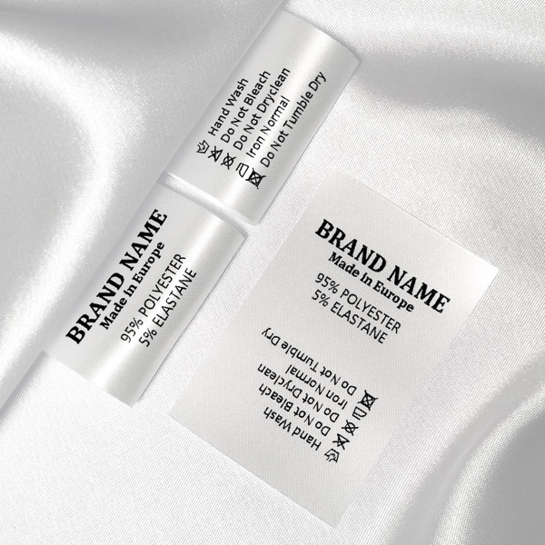 Hienosta valkoisesta satiinista valmistettu pesulappu, räätälöidyllä mustalla tekstillä, sopii erilaisille vaatteille. Tämän tyyppiset tekstiililaput ovat valmistettuja digitaalisen painamisen alan kehittyneintä tekniikkaa käyttäen, tekstiilitukialustalla. Laput ovat painettuja erityiselle satiinille lämpösiirtomenetelmällä, painolaatu on vaikuttava ja laput kestävät pesun erittäin hyvin.