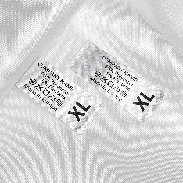Pesulappu merkki kanssa koot ja pesusymbolit korkealaatuisesta satiinista, ommeltava vaatteisiin. Tämän tyyppiset tekstiililaput ovat valmistettuja digitaalisen painamisen alan kehittyneintä tekniikkaa käyttäen, tekstiilitukialustalla. Laput ovat painettuja erityiselle satiinille lämpösiirtomenetelmällä, painolaatu on vaikuttava ja laput kestävät pesun erittäin hyvin.