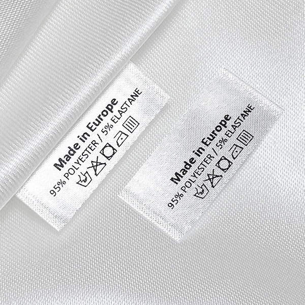 Satiininen tekstiili lappu, mukautettu jossa on pesu- ja hoitosymbolit tekstiilimateriaalista, josta vaatekappale on valmistettu, ommeltava vaatteisiin. Tämän tyyppiset tekstiililaput ovat valmistettuja digitaalisen painamisen alan kehittyneintä tekniikkaa käyttäen, tekstiilitukialustalla. Laput ovat painettuja erityiselle satiinille lämpösiirtomenetelmällä, painolaatu on vaikuttava ja laput kestävät pesun erittäin hyvin.